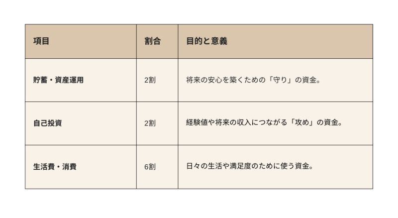 収入の使い道について、手取りの金額を以下の割合で振り分ける「2:6:2ルール」を推奨しています。