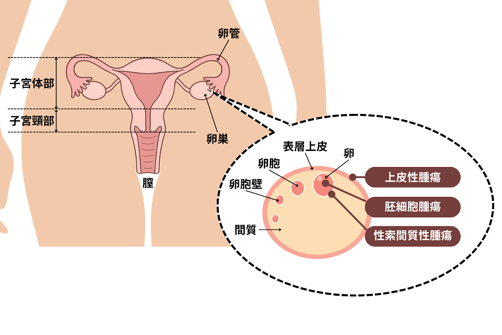 - 胚細胞腫瘍:卵子をつくる細胞から発生し、若い女性に多いタイプ。
