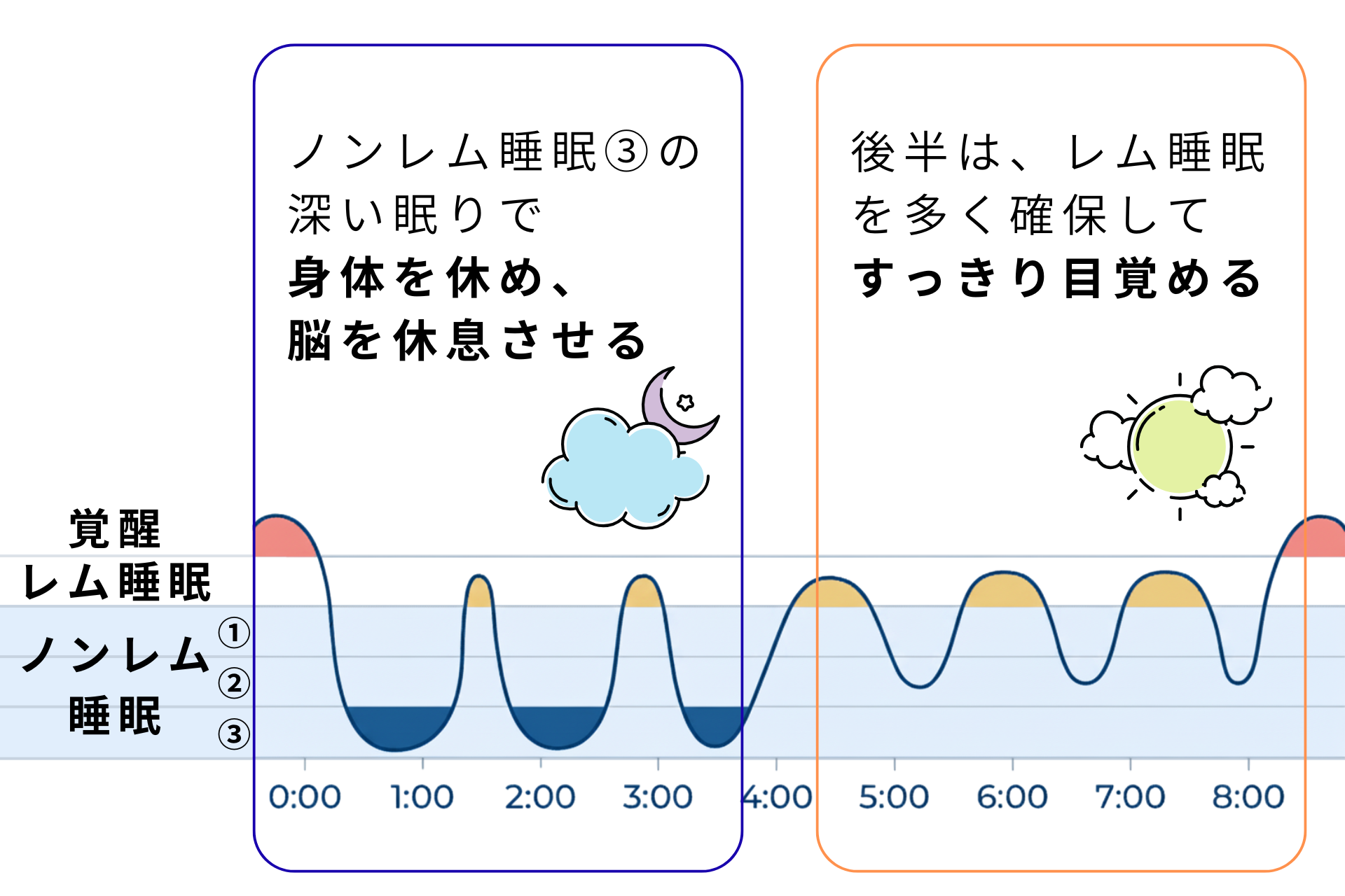人は睡眠中にノンレム睡眠(深い眠り)とレム睡眠(浅い眠り)を交互に繰り返しています。ノンレム睡眠とレム睡眠のバランスが崩れると、脳や体の回復が妨げられ、成長ホルモンの分泌も低下しやすくなります。